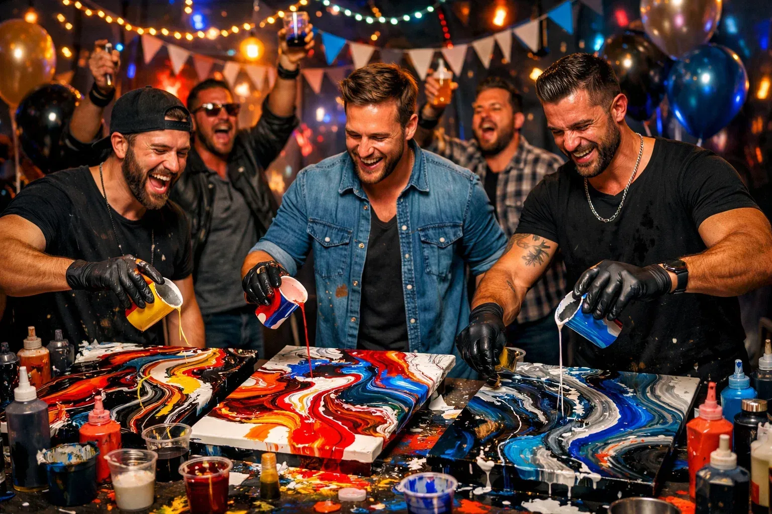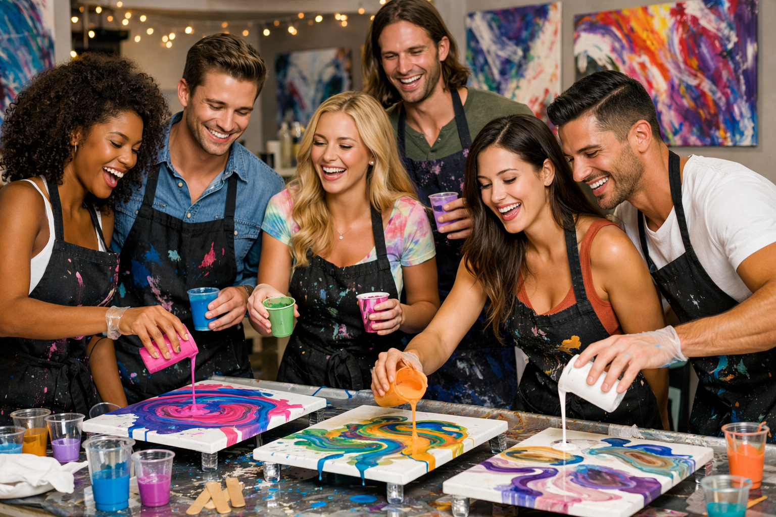 All materials needed to create acrylic pour art (tables, tarps, paints, aprons, etc)